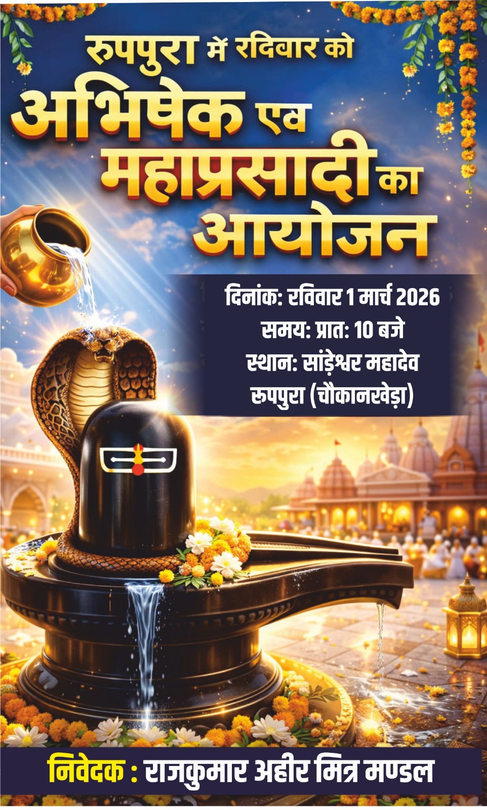 जावद/नीमच । युवा कांग्रेस के जिला महासचिव राहुल अहीर ने जानकारी देते हुए बताया की प्रतिवर्षानुसार इस वर्ष भी किसान नेता राजकुमार अहीर का जन्मदिन महाशिवरात्रि के दिन था। श्री अहीर के परिवार में मांगलिक कार्य होने की वजह से उनका जन्मदिन पर कोई भी आयोजन नहीं किया जा सका ।इस वर्ष किसान नेता राजकुमार अहीर का जन्मदिन  रविवार 1 मार्च 2026 को रूपपुरा (चौकानखेड़ा) के पास सांड़ेश्वर महादेव में मनाया जायेगा । सर्वप्रथम श्री अहीर के द्वारा प्रातः 10 बजे भगवान सांड़ेश्वर महादेव मंदिर पर अभिषेक किया जायेगा तत्पश्चात महाप्रसादी का आयोजन होगा । राहुल अहीर ने समस्त क्षेत्रवासियों से आग्रह किया है कि अभिषेक एवं महाप्रसादी आयोजन को सफल बनाकर अपने चहेते नेता राजकुमार अहीर को बधाई प्रेषित करें ।