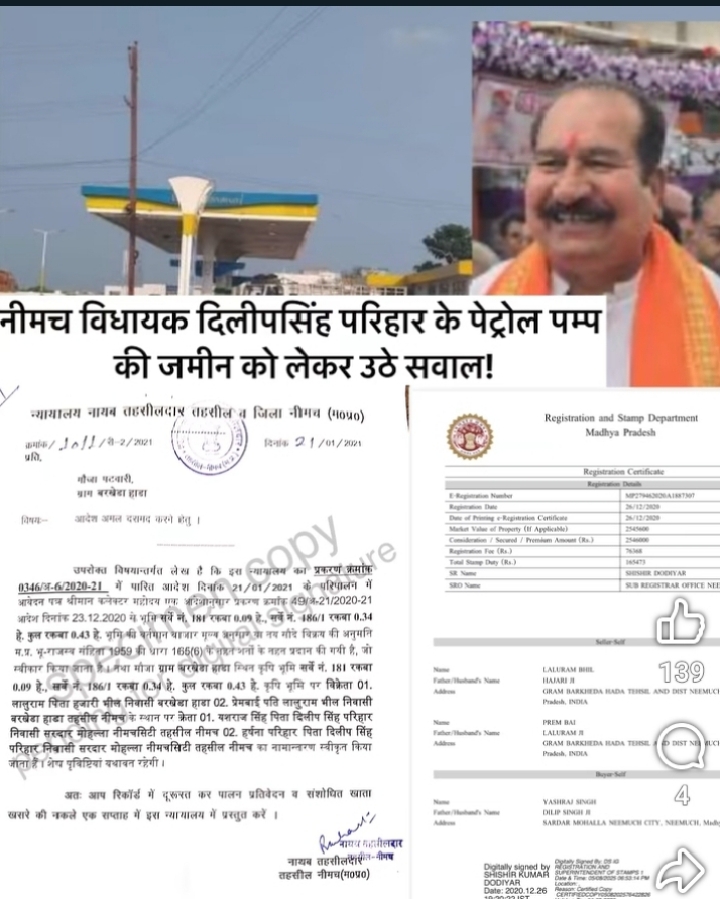 नीमच। वो पहले साधारण थे.फिर राजनीति में कदम रखा तो असाधारण बने…जनता की तकलीफों को समझा जाना और इसी जनसेवा का प्रतिफल उन्हें सहानुभूति के रूप चुनावों में मिला…जनता ने आशीर्वाद दिया और विधायक भी बनाया…निरंतर प्रदेश की सत्ता में अपना जनप्रतिधि चुनकर भेजा…लेकिन जैसा कि कहा जाता है कि सत्ता का नशा चढ़ने में भी देर नहीं लगती…फिर चाहे कोई साधारण व्यक्तित्व से जुड़ा नेता ही क्यों न हो…कुर्सी मिलते ही पद के पॉवर से अपने हित साधना हर किसी की लालसा बन जाती है, कुछ ऐसा ही घटनाक्रम सामने आया है, मध्यप्रदेश की नीमच विधानसभा में जहां विधायक दिलीप सिंह परिहार पर आदिवासी की जमीन के हस्तांतरण को लेकर विवाद खड़ा हो गया है…! दरहसल जिले में आदिवासी भूमि के हस्तांतरण को लेकर एक मामला चर्चा में है। आरोप है कि ग्राम बरखेड़ा हाड़ा, पटवारी हल्का चम्पी, तहसील एवं जिला नीमच स्थित अनुसूचित जनजाति वर्ग की भूमि को भाजपा विधायक दिलीपसिंह परिहार के पुत्र यशराजसिंह एवं पुत्री हर्षना परिहार के नाम विक्रय की अनुमति महज़ सात दिनों में प्रदान कर दी गई। पूरे घटनाक्रम की रफ्तार को लेकर प्रशासनिक प्रक्रिया पर सवाल खड़े हो रहे हैं।