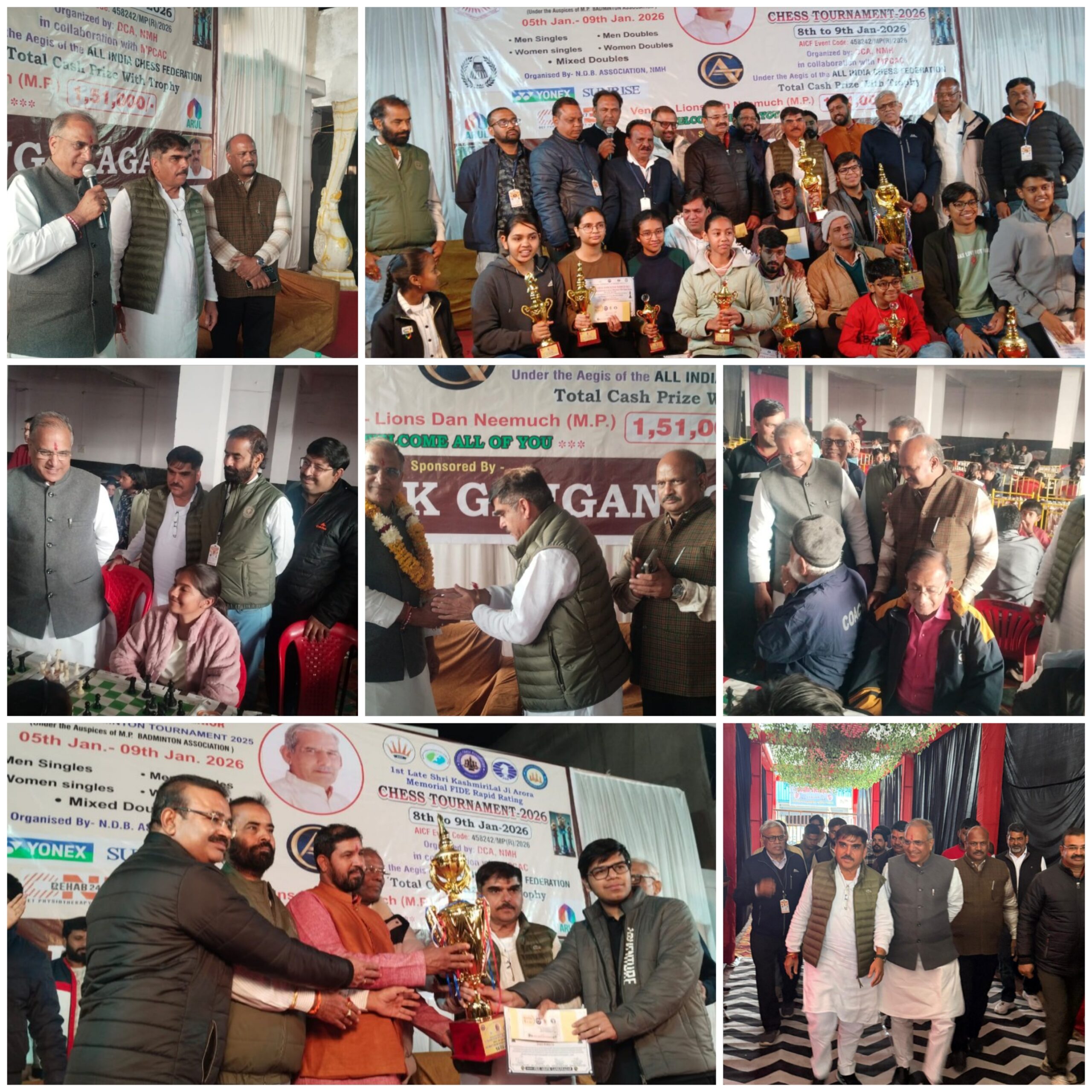 पुरस्कार वितरण, कार्यक्रम के मुख्य अतिथि गोपाल गर्ग जीजी स्वाति चोपड़ा नगर पालिका अध्यक्ष व समाजसेवी अशोक अरोरा ने पुरस्कारों का वितरण किया। करीब 43 कैटेगरी में पुरस्कार किए गए। जिसमे ट्राफी के साथ नगद पुरस्कार भी दिए। मेन प्राइज में अरुण कटारिया राजस्थान ₹21000/-, प्रणव चौरड़िया राजस्थान ₹11000/-शर्मा, हरीश दिल्ली ₹ 5100/-,प्रतापसिंह सोलंकी मप्र ₹ 2100/-, मृदुल त्रिपाठी मप्र ₹ 2100/-, हितेश एस. जरिया मप्र ₹ 2100/-, वैभव तोमर मप्र ₹ 2100/-, डॉ. अरविंद गोस्वामी मप्र आर.के.गुप्ता राजस्थान ₹ 2100/-, यशवंत परमार नीमच ₹ 2100/- तथा बेस्ट एमपी में अमोल चौहान (MP) ₹5100/-, एस. के. राठौर (MP) ₹ 2100/- एवं बेस्ट नीमच में जयंत रेकवार नीमच ₹ 5100/- व जीवन पाटीदार नीमच ₹ 2100/- का पुरस्कार जीते। इसी कड़ी में अन्य कैटेगरी में भी नगद पुरुस्कार व सर्टिफिकेट सहित टाफियां वितरण किया।