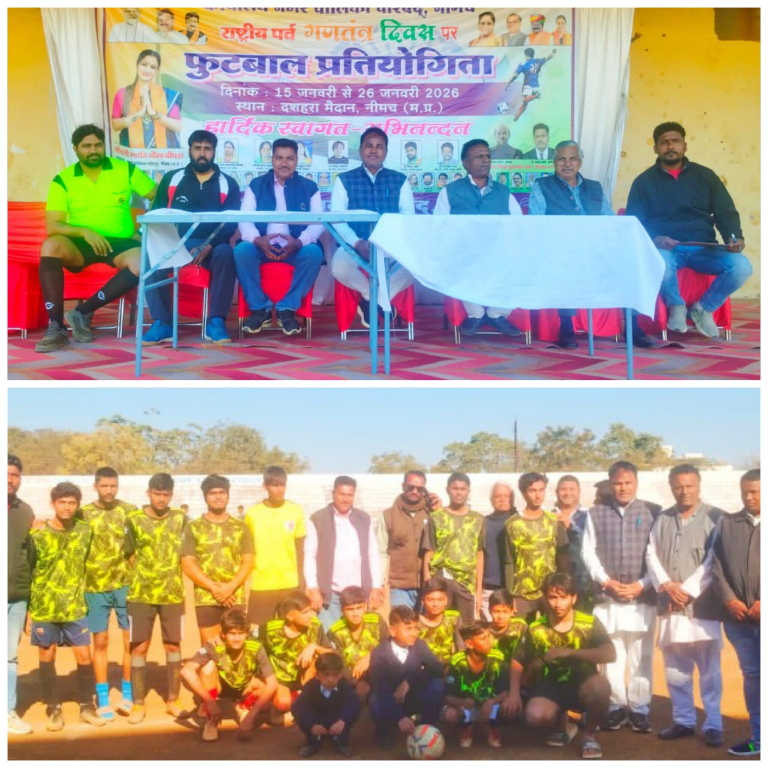 नीमच। खिलाड़ी को खेल भावना से खेल को खेलना चाहिए। हार और जीत के खेल के दो पहलू है आज हारने वाला कल अवश्य जीत दर्ज करता है पर मेहनत में कोई कमी नहीं रहना चाहिए। अच्छे खिलाड़ियों में से ही राष्ट्रीय स्तर पर खिलाड़ी जाते हैं । नीमच नगर पालिका परिषद द्वारा एवं जिला फुटबाल संघ नीमच के बैनर तले 26 जनवरी के पूर्व आयोजित 15 जनवरी से प्रारंभ हुई फुटबॉल प्रतियोगिता में मुख्य अतिथि के तौर पर उपस्थित समाजसेवी एवं पार्षद हरगोविंद दीवान ने व्यक्त करते हुए कहा कि आप सभी को अच्छा प्रदर्शन कर नीमच का नाम राष्ट्रीय स्तर पर गौरवान्वित करना है। इस अवसर पर पूर्व पार्षद मुकेश पोरवाल ने कहा कि नीमच का नाम फुटबॉल में पूरे देश में लिया जाता है यहां के खिलाड़ियों ने मध्यप्रदेश एवं देश स्तर पर अपनी कला का प्रदर्शन किया है। हम सभी नगर पालिका अध्यक्ष श्रीमती स्वाति गौरव चोपड़ा से मांग करते हैं कि इंदिरा नगर ग्वालटोली क्षेत्र में स्टेडियम का निर्माण कराया जाए जिससे कि खिलाड़ीयो को खेल से प्रेमियों को लाभान्वित होंगे। इस अवसर पर पार्षद भारत सिंह अहीर,पार्षद दुर्गा शंकर भील,पार्षद रामचंद्र धनगर विशेष रूप से उपस्थित थे । कार्यक्रम का संचालन डॉ दिनेश बैस ने किया।
