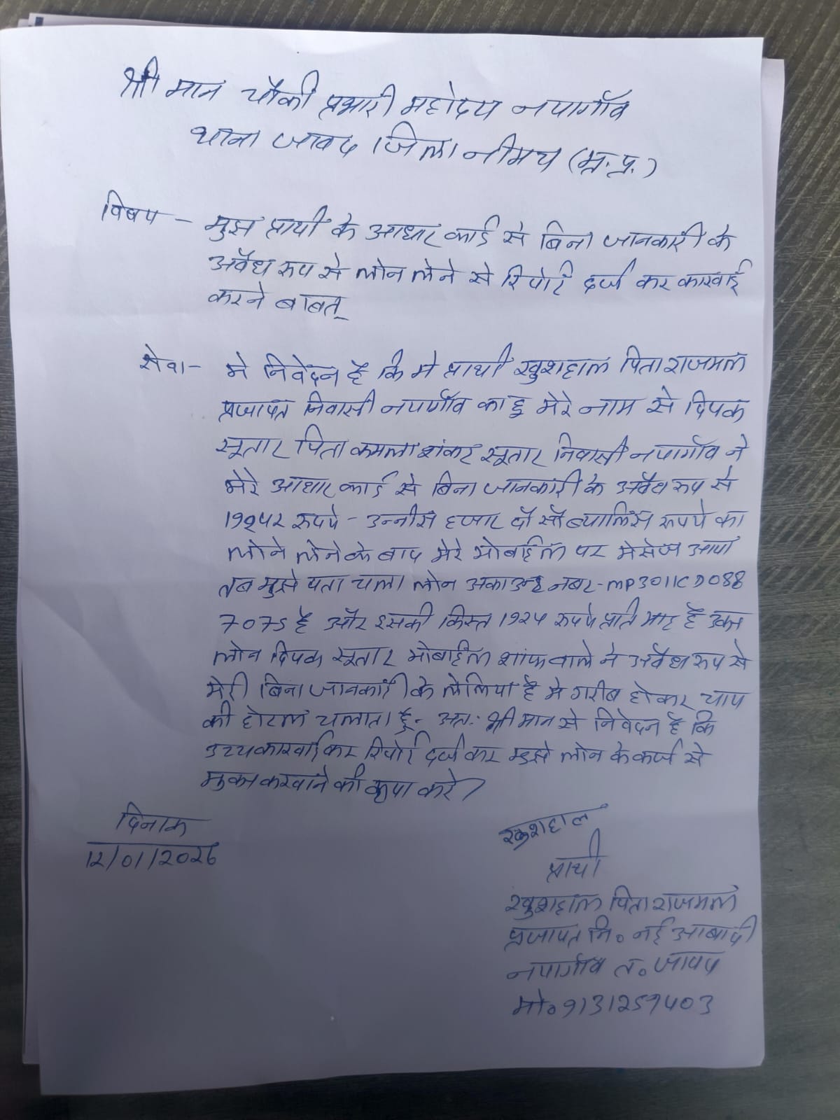 नीमच। नयागांव क्षेत्र में एक युवक के साथ मोबाइल फाइनेंस के नाम पर धोखाधड़ी का मामला सामने आया है। पीड़ित युवक खुशाल उर्फ सोनू प्रजापत ने आरोप लगाया है कि विश्वकर्मा मोबाइल दुकान संचालक ने उसकी बिना जानकारी और अनुमति के उसके नाम पर मोबाइल फाइनेंस कर दिया। जब मोबाइल की किस्त भरने का संदेश आया, तब उसे इस फर्जीवाड़े की जानकारी मिली। इसके बाद उसने 12 जनवरी को नयागांव पुलिस चौकी में लिखित शिकायत दर्ज कराई। पीड़ित का कहना है कि 16 जनवरी तक कोई ठोस कार्रवाई नहीं हुई है। खुशाल ने बताया कि उसने एक वर्ष पहले विश्वकर्मा मोबाइल दुकान से नकद भुगतान कर मोबाइल खरीदा था,जिसका बिल उसके पास मौजूद है। उसी समय दुकानदार ने आधार कार्ड व अन्य दस्तावेज ले लिए। आरोप है कि इन्हीं दस्तावेजों का दुरुपयोग कर टीवीएस क्रेडिट फाइनेंस के माध्यम से उसके नाम पर किसी अन्य व्यक्ति को मोबाइल फाइनेंस कर दिया गया। जब पीड़ित ने दुकानदार से सवाल किया तो उसे धमकाया गया कि उसकी चाय की दुकान हटवा दी जाएगी और पुलिस उनका कुछ नहीं बिगाड़ पाएगी। पीड़ित को आशंका है कि इसी तरह अन्य लोगों के साथ भी धोखाधड़ी की गई होगी। जांच अधिकारी कन्हैयालाल राठौर ने बताया कि टीवीएस क्रेडिट फाइनेंस से संबंधित रिकॉर्ड मंगवाया जा रहा है। सभी तथ्यों की पुष्टि के बाद आगे की कार्रवाई की जाएगी।